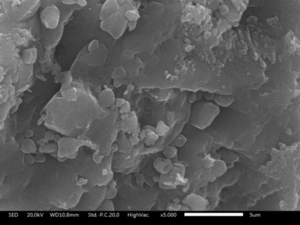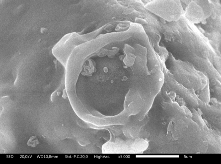 The morphological shape of microcapsules coated with Ethocel 10 cP shows a flatter surface (fig. 5) compared to microcapsules coated with polyvinyl alcohol, which offer an uneven surface (fig. 4) observed before and after testing during the period up to the 90th day.