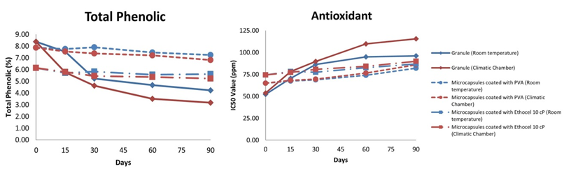 Based on the results of measurements of total phenolic content and activity in microcapsules carried out at 0, 30, 60, and 90 d, microcapsules with polyvinyl alcohol coatings, although they have greater coating efficiency than ethocel 10 cP coatings, show a percent decrease in the concentration of phenol levels. The total and IC50 values were greater than those of the microcapsules coated with 10 cP ethocel. This could be due to differences in the characteristics of the materials and their interactions with the extracts up to the microencapsulation stage.