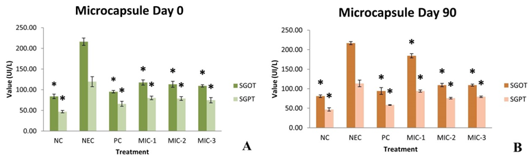Fig. 5: Effect of the microcapsule S. oleosa leaf extract on SGOT and SGPT levels of the rat. A: Microcapsule day 0, B: Microcapsule day 90 (after being stored in the climatic chamber). *p<0.05 significant when compared to the negative control group. NC: Normal control; NEC: Negative control; PC: Positive control; MIC-1: Uncoated granules; MIC-2: Microcapsule coated with polyvinyl alcohol; MIC-3: Microcapsule coated with Ethocel 10 cP
