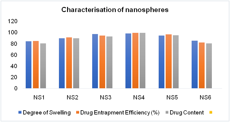The controlled and sustained drug release observed in Formulation NS4 is a desirable characteristic in nanosphere-based drug delivery systems. The high drug entrapment efficiency indicates that a significant amount of the drug is effectively encapsulated within the nanospheres, ensuring efficient drug delivery to the target site. Additionally, the proper swelling behavior can contribute to the controlled release of the drug from the nanospheres.