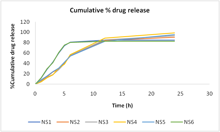Fig. 3: % Cumulative drug release for polymeric nanospheres (NS1-NS6)