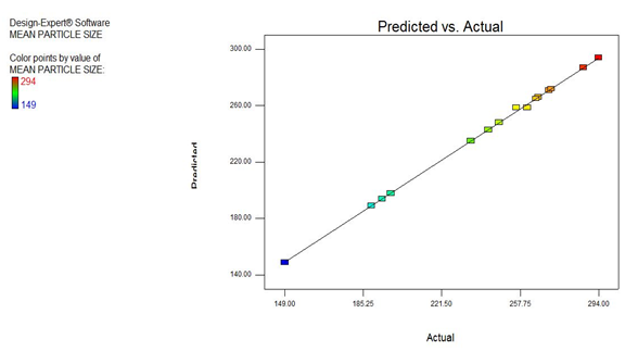 PS determination is an important quality control measure to measure the ability of any NSs formulation. PS is a critical value for NSs; smaller PS provides a larger interfacial surface area for drug absorption. In addition, a smaller PS may permit a faster release rate [37]. The mean particle size of the NSs was found to be in the range of 149-294 nm. The polynomial model shown that all the variables (X1, X2 and, X3) have a significant effect. The observed values are in close agreement with the predicted values, as shown in fig. 1.
