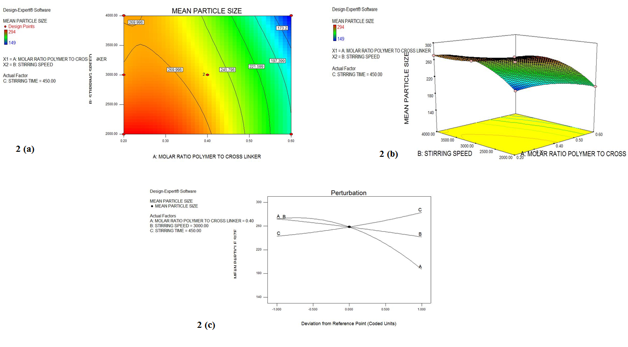 Fig. 2(a): Contour plot showing the influence of molar ratio polymer to cross-linker, stirring time, and stirring speed on mean particle size fixed level of C; 2 (b): 3D-Contour Plot showing the influence of molar ratio polymer to cross-linker, stirring time, and stirring speed on mean particle size fixed level of C; 2 (c): Two-dimensional perturbation plot showing the influence of molar ratio polymer to cross-linker, stirring time, and stirring speed on mean particle size fixed level of C