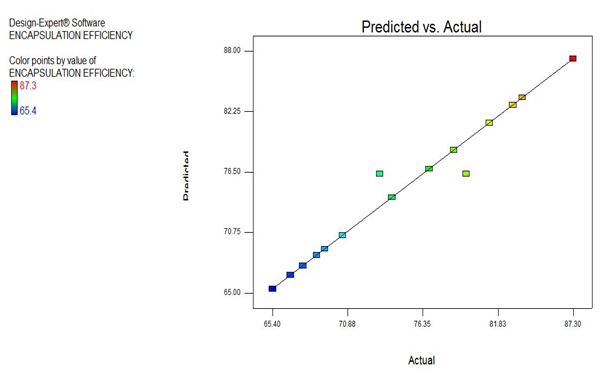 Fig. 3: Comparison between predicted and actual values of entrapment efficiency (%)