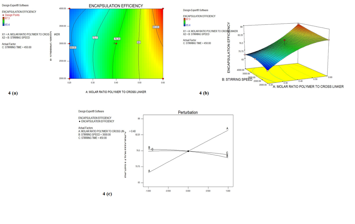 Fig. 4(a): Contour plot showing the influence of molar ratio polymer to cross linker, stirring time, and stirring speed on EE fixed level of C; 4(b): 3D-Contour Plot showing the influence of molar ratio polymer to cross linker, stirring time, and stirring speed on EE fixed level of C; 4(c): Two-dimensional Perturbation plot showing the influence of molar ratio polymer to cross linker, stirring time, and stirring speed on EE fixed level of C