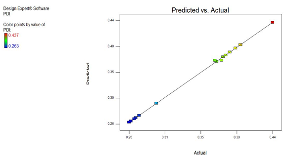 Fig. 5: Comparison between predicted and actual values of polydispersity index (PDI)