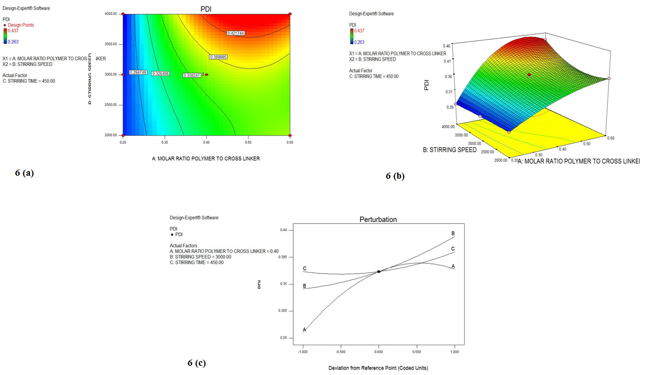 Fig. 6(a): Contour plot showing the influence of molar ratio polymer to cross linker, stirring time, and stirring speed on PDI fixed level of C; 6(b): 3D-Contour Plot showing the influence of molar ratio polymer to cross linker, stirring time, and stirring speed on PDI fixed level of C; 6(c): Two-dimensional Perturbation plot showing the influence of molar ratio polymer to cross linker, stirring time, and stirring speed on PDI fixed level of C