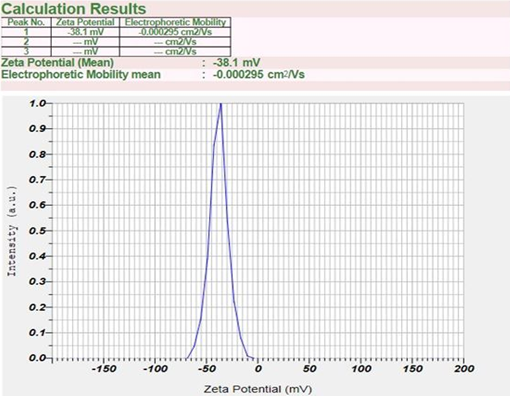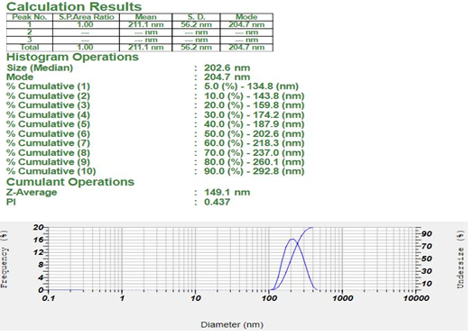 The mean PS of optimized formulation was found to be 149 nm and 294 nm (within nanometric range). PS is a critical value for NSs; smaller PS provides a larger interfacial surface area for drug absorption. In addition, a smaller PS may permit a faster release rate [38]. PDI of optimized formulation was found out to be 0.437, indicating uniformity of particle size within formulation (fig. 7 and 8). PDI is significant in terms of stability, solubility, dissolution and permeation through various tumour tissues and organs [39]. The zeta potential study was done by zetasizer. The zeta potential for the optimized formulation was found to be 38.1Mv, which shows that the formulation is stable [40]. The EE of the NSs was found to be in the range of 65.4% to 87.3%.
