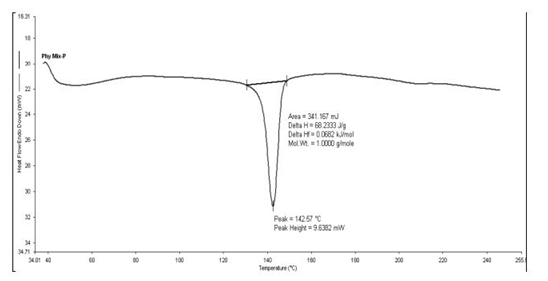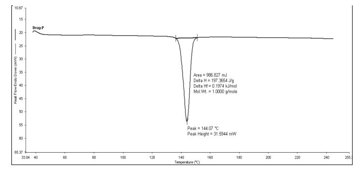 The physical mixture of Entrectinib, β-CD and DPC showed sharp melting endotherm at an onset temperature of around 130-132 °C, a peak temperature of 142.57 °C and ends at the temperature of around 150-152 °C [20]. Furthermore, it also slightly shows a glass transition at 216-218 °C may be corresponding to the melting. Thus, it indicates no interaction between the Entrectinib and excipients as shown in fig. 13 and 14.