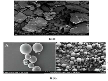 Fig. 15(a): SEM images of pure Entrectinib; 15(b) SEM micrograph of Entrectinib loaded NSs at magnification of 45000×