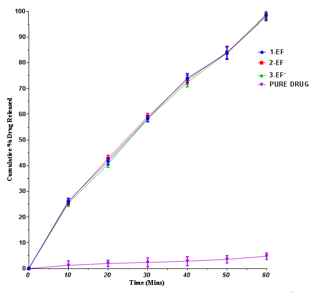Fig. 16: In vitro release study of Entrectinib NSs (triplicate) in comparison with pure drug, (All determinations were performed in triplicate and values were expressed as mean±SD, n=3)