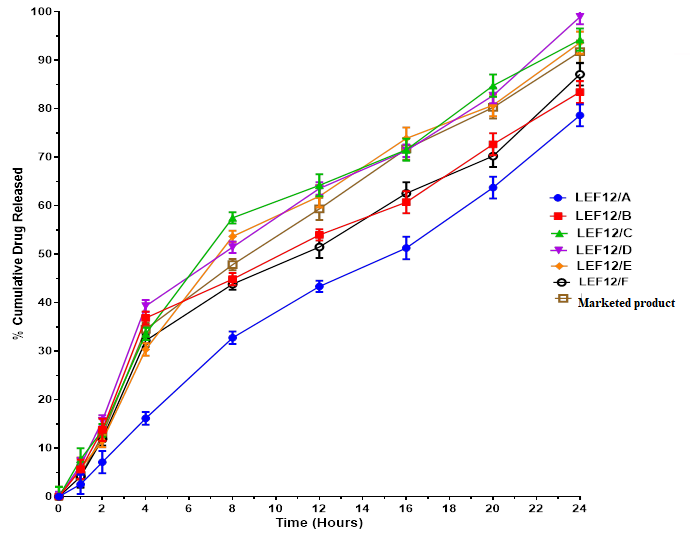 Fig. 17: Drug released profile of entrectinib nanosponges loaded tablets and marketed product, (All determinations were performed in triplicate and values were expressed as mean±SD, n=3)