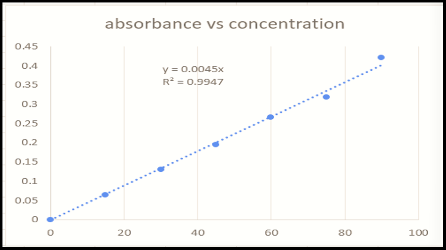 The calibration curve was plotted by measuring the absorbance at 263 nm given fig. 2. The standard calibration plots of the drugs were prepared in 0.1N HCL, pH 1.2. The UV absorption data of extract at 263 nm showed good linearity with the regression coefficient (R2) of 0.9947 over the concentration range 15-90 µg/ml passing through the origin and hence it follows the Beer–Lamberts law.