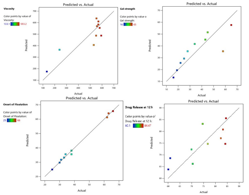 Fig. 3: Predicated vs. Actual graphs of a) viscosity b) gel strength c) onset of flotation d) drug release at 12h of in situ gel formulations