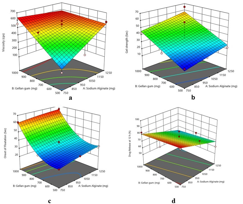 The effect of the concentration of sodium alginate and gellan gum on the gel strength of formulations obtained from 32 full factorial designs showed that with an increase in both gellan gum and sodium alginate concentration, there was an increase in gel strength (table 1 and 2 and fig. 2b and 3b).