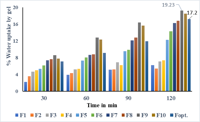 The amount of water associated with the drug delivery system plays an important role in determining the release of the drug from the polymer matrix. The drug release mainly involves water penetration into the matrix and the simultaneous release of the drug through diffusion or dissolution. The percentage of water uptake of all the formulations is given in fig. 5. Compared with other formulations, F9 showed a better water uptake of 19.22%, whereas the optimized formulation was 17.2 %.