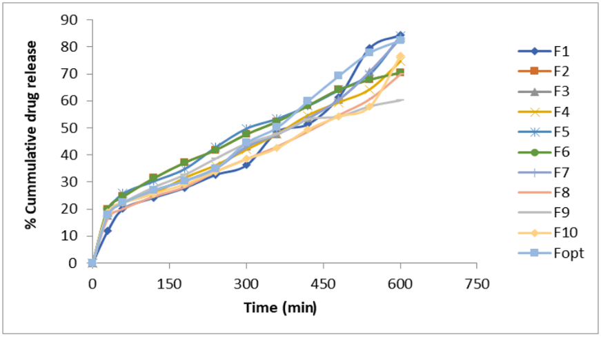From the in vitro drug release studies, it was observed in fig. 6, that as the gelling agent concentration increases, the drug release from the gastroretentive in situ gel prepared decreased. The drug-releasing pattern of different formulations contains different concentrations of gelling agents are given as follows: F9˂ F3˂ F8˂ F6˂ F4˂ F5˂ F2˂ F7˂ F10<Fopt ˂ F1 at the end of 12h. as the concentration of sodium alginate, gellan gum increased there was a decrease in the drug release [30]. Among all the formulations, F9 shows a slow and sustained release pattern.