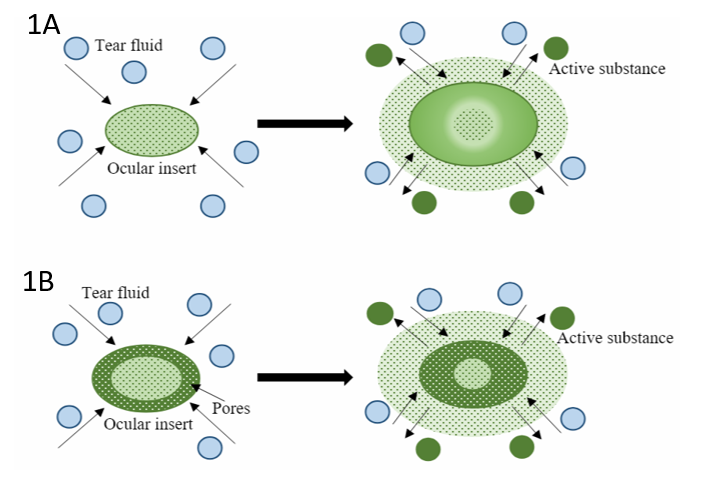 Fig. 1: Release of active substances by diffusion mechanism: 1А-Swelling of the ocular insert with the release of API; 1B-API release through a microporous membrane
