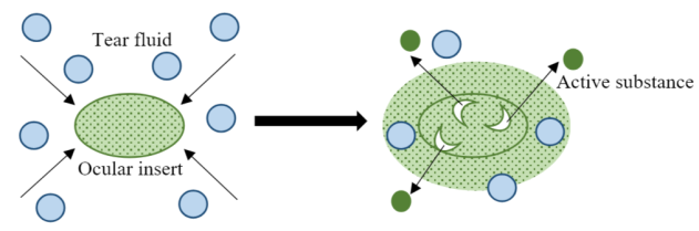 In the case of bioerosion, the OI should consist of a biodegradable matrix into which the drug is directly evenly dispersed. So, when the OI comes into contact with the tear fluid, there is a controlled release of API with simultaneous destruction of the matrix (fig. 2).