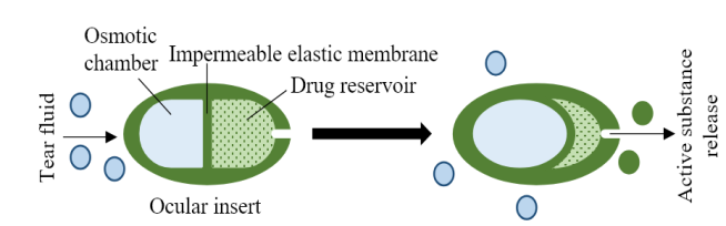 The osmosis mechanism is designed so that when the OI meets the cornea the tear fluid diffuses through a semi-permeable membrane into a chamber with an osmotic substance, which leads to its stretching and at the same time, compresses the reservoir containing the active ingredient. As a result, the drug is released through a special hole (fig. 3).