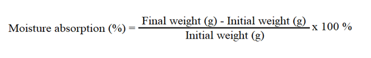 For testing the moisture absorption by exposure to them the water environment of pre-weighed inserts were immersed in the tablet containing a phosphate buffer at 37 °C. The samples were removed from the phosphate buffer through equal time intervals and re-weighed after excess surface solution with filtration paper. The parameter was calculated by formula: