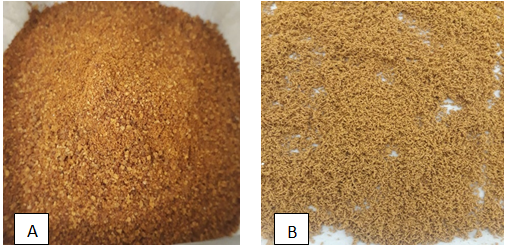 Fig. 1: The dried extract of Curcuma mangga with PVP (A) and corn starch (B) as the adsorbents