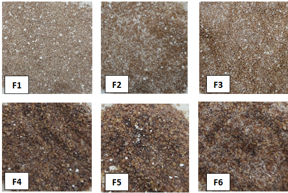 Fig. 2: The mixture of capsule granule mass, F1= mixture of CMDE-CS with lactose as filler, F2= mixture of CMDE-CS with Avicel as filler, F3 = mixture of CMDE-CS with maltodextrin as filler, F4 = mixture of CMDE-PVP with lactose as filler, F5 = mixture of CMDE-PVP with Avicel as filler, F6= mixture of CMDE-PVP with maltodextrin as filler