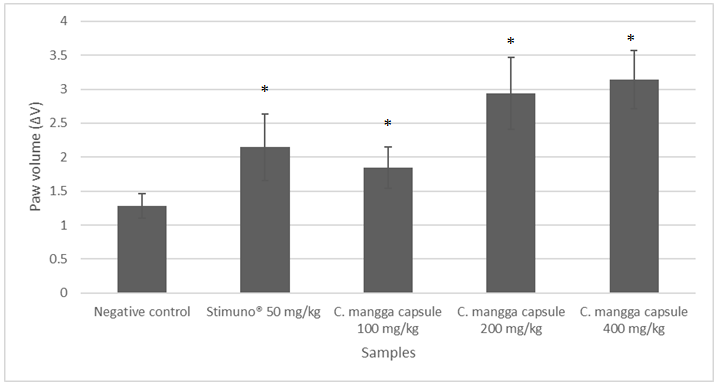 The administration of C. mangga capsule of formula F2 enhanced the footpad thickness of rats as compared to those of negative control (P<0.05). Of all samples tested, C. mangga capsule at dose of 400 mg/kg bw demonstrated the highest stimulation on DTH response (fig. 3). Suprisingly, the stimulation was higher than those of positive control with paw volume of 3.14±0.19; 2.14±0.21, for C. mangga capsule and positive control, respectively.