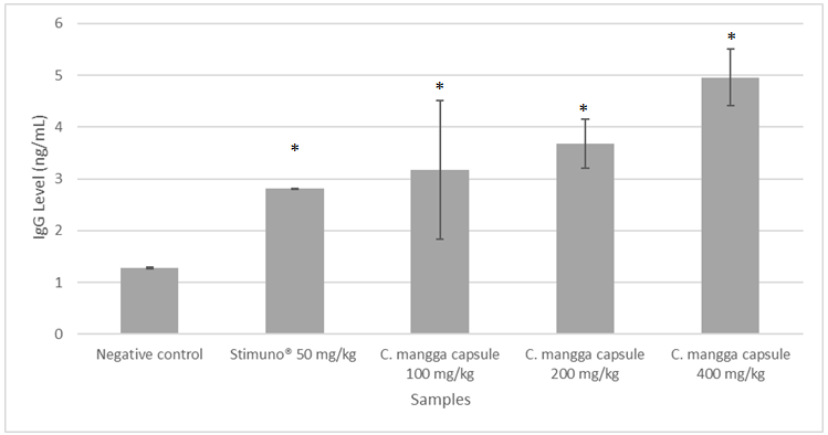 Fig. 4: Effect of capsule containing dry ethanol extract C. mangga extract on immnunoglobulin G production (Data: mean±SD, n: 5; *P<0.05 significant to respective control)
