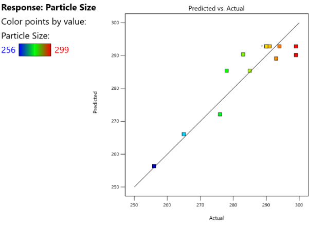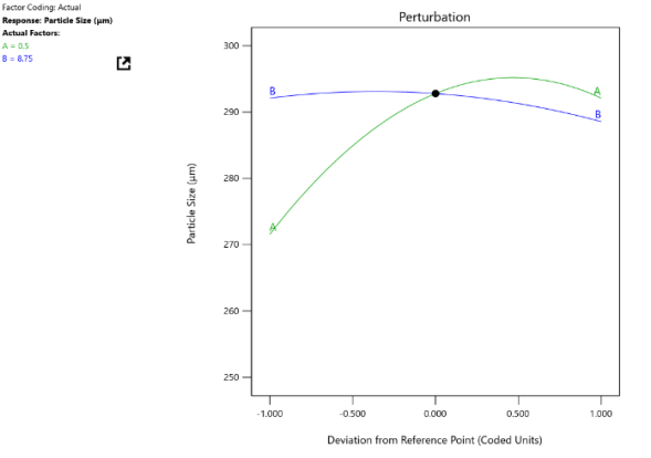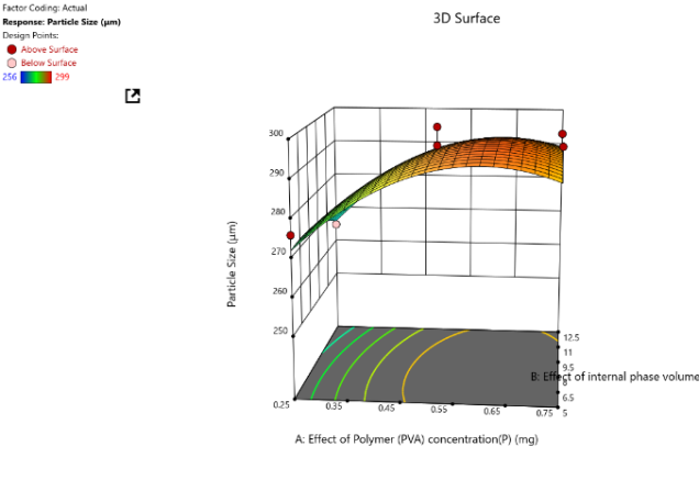 On the other hand, the negative coefficient for internal phase volume (-1.77) implies that an increase in the internal phase volume decreases particle size. The same was explained using the model graph 1) Perturbation curve 2) 3D surface curve and 3) Predicted vs Actual curve (fig. 6). In the Predicted vs. Actual curve, most points fall on the straight line, confirming that particle sizes and drug entrapment efficiency are well-correlated with the independent variables. The perturbation curve represents the hyperbolic curve, indicating that particle size directly affects PVA concentration and is inversely related to internal phase volume. This may be due to the lesser availability of polymer to entrap the drug, and the increase in mean particle size is due to increasing PVA concentration. The observed change in particle size with the change in surfactant concentration was similar to related works published.