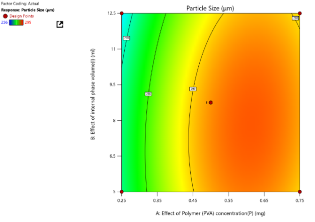 To derive a relation between the independent variables with particle size and entrapment efficiency of micro sponges, different mathematical models like linear, 2FI, Quadratic, and cubic were analyzed using the Design Expert software. The design fits the quadratic model from the ANOVA analysis for particle size and entrapment efficiency. The Model F-value of 8.67 implies the model is significant. The Lack of Fit F-value of 4.96 implies nonsignificant. The Model F-value of 34.38 implies the model is significant. The Lack of Fit F-value of 2.53 implies the Lack of Fit is not significant for entrapment efficiency. The equation in terms of coded factors is used to make predictions about the response for given variables. Here, the independent variable is coded as A for the effect of PVA concentration and code B is the effect of internal phase volume. The coded equation was used to make predictions about the response (particle size, drug entrapment efficiency, and drug loading capacity) based on the values of the independent variables (coded factors). The positive coefficient for PVA concentration (+10.26) suggests that an increase in PVA concentration leads to an increase in particle size and drug entrapment efficiency (+6.32).