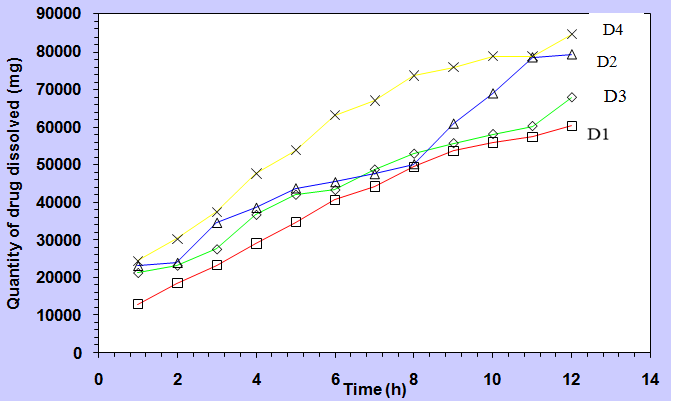 Fig. 7: In vitro drug release profile of AC-M batch (D1-D4), values represent mean (n=3)