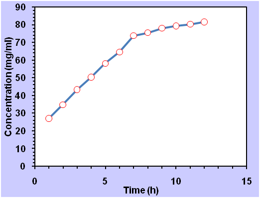 According to the predicted values of the PK Solver, the maximum concentration of 81.62 mg/ml was attained at 12 h. This gives the impression that the prepared gel can sustain the release of a drug. Hence, the formulation MS4 of the drug (2g), ethyl cellulose (0.25g), internal phase volume (12.500), PVA concentration (0.636), external phase volume (50 ml) was found to be optimized, which suggests that AC-M gel has good topical application [29-31].