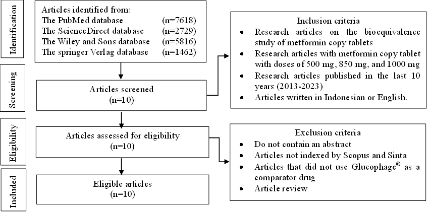 Research article search on reputable databases, which are PubMed, ScienceDirect (Elsevier), John Wiley and Sons, and Springer Verlag collected in December 2022-January 2023. The inclusion criteria for articles are research articles on the bioequivalence study of metformin copy tablets, research articles with metformin copy tablets with doses of 500 mg, 850 mg, and 1000 mg, research articles published in the last 10 y (2013-2023), and articles written in Indonesian or English. Articles excluded have criteria that do not discuss the bioequivalence study of metformin. The extracted data are the main author’s name, year of publication, study design, number of participants, doses, test and innovator drug data, Area Under Curve (AUC0-∞ and AUC0-t), time taken to reach the highest concentration (Tmaks), highest concentration (Cmaks), T1/2, and 90% Confidence Interval (CI). Fig. 1 shows the PRISMA flow diagram of the article selection process.