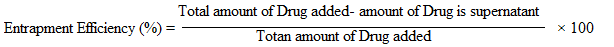 Glyc-NPs suspension was ultra-centrifuged (Remi Mumbai, India) at 13,000rpm at 4 °C for 30 min and the supernatant was collected. Amount of unentrapped drug in the supernatant was determined by UV spectroscopy. Equation used to calculate the percentage drug entrapment and drug loading is given below: