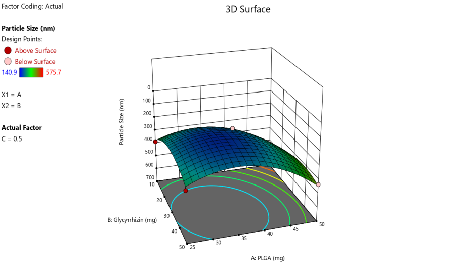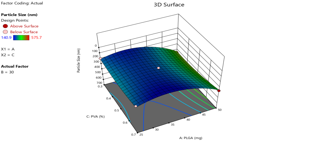 The term AB, AC, BC, A², B², C² shows the interaction effect, which indicates the influence of any two factors simultaneously on the particle size. Optimizing the particle size to a minimum is necessary to enhance internalization and achieve higher cellular concentration, therefore enhancing therapeutic efficacy.