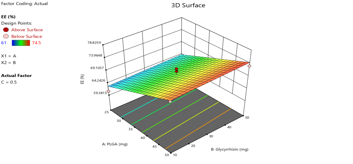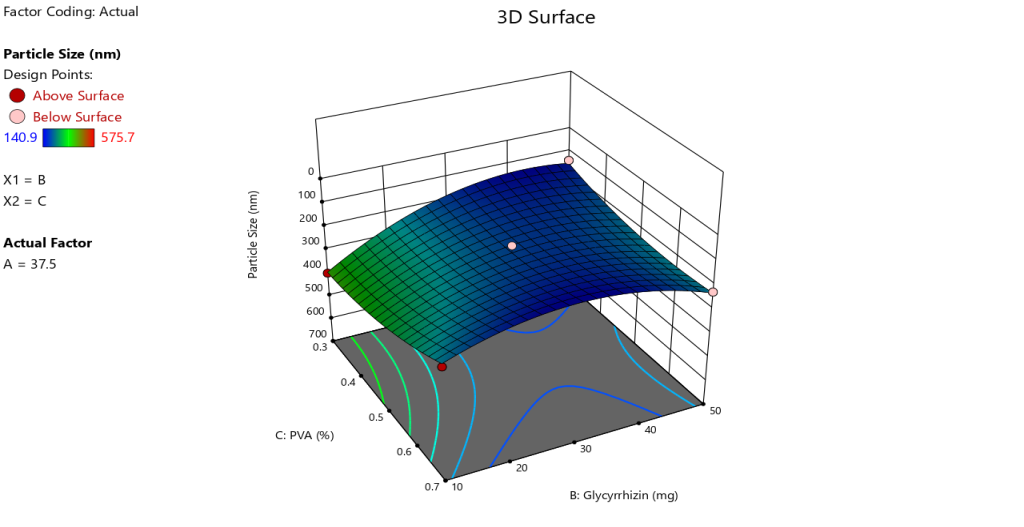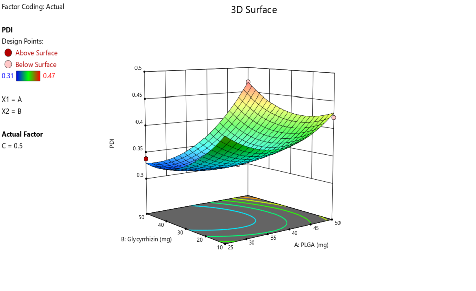 The stability of the formulation depends on homogeneity in the size of nanoparticles in the formulation. The above equation shows that the amount of polymer (A) had a positive impact on PDI whereas glycyrrhizin (B) and PVA (C) concentration had a negative effect.
