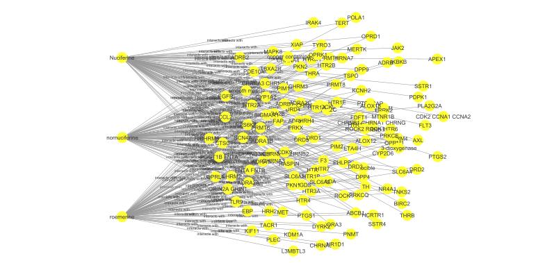 The canonical SMILE of the compounds was uploaded to the Swiss Target Prediction database (http://www.swisstargetprediction.ch/)[24]. The compound-target network was visualized using Cytoscape (3.9.0)[25].