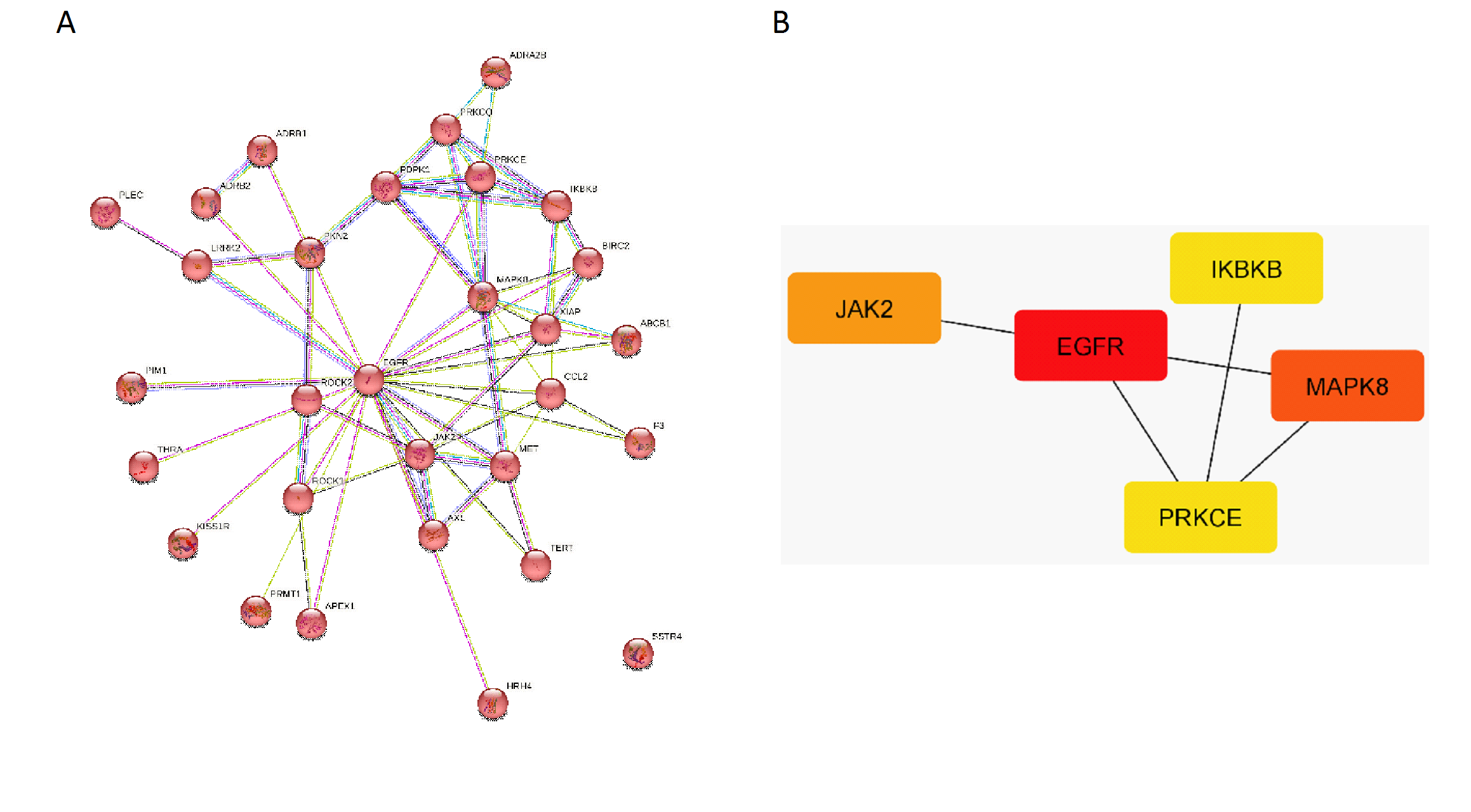 The 55 intersecting targets were imported into the STRING database, and the potential relationships among them were investigated. A PPI network with a confidence score of 0.9 was constructed (fig. 4.). STRING database analysis revealed that the average node degree, defined as the average number of interactions of a protein in a network, was 3.93, and the local clustering coefficient, defined as the wellness of the connected nodes in a network, was 0.651. The interactions between the targets comprised 30 nodes and 59 edges, with each edge representing an association between nodes. Cytoscape analysis revealed one main cluster associated with the PPI network (fig. 4). According to the scores of degrees, closeness centrality, betweenness centrality, and clustering centrality, signal transducer and activator of Epidermal Growth Factor Receptor (EGFR), Mitogen-Activated Protein Kinase 8 (MAPK8), Janus Kinase 2 (JAK2), Inhibitor of Nuclear Factor Kappa B Kinase Subunit Beta (IKBKB), and Protein Kinase C Epsilon (PRKCE) were identified as the top five intersecting targets of aporphine alkaloid and breast cancer interaction (fig. 4).