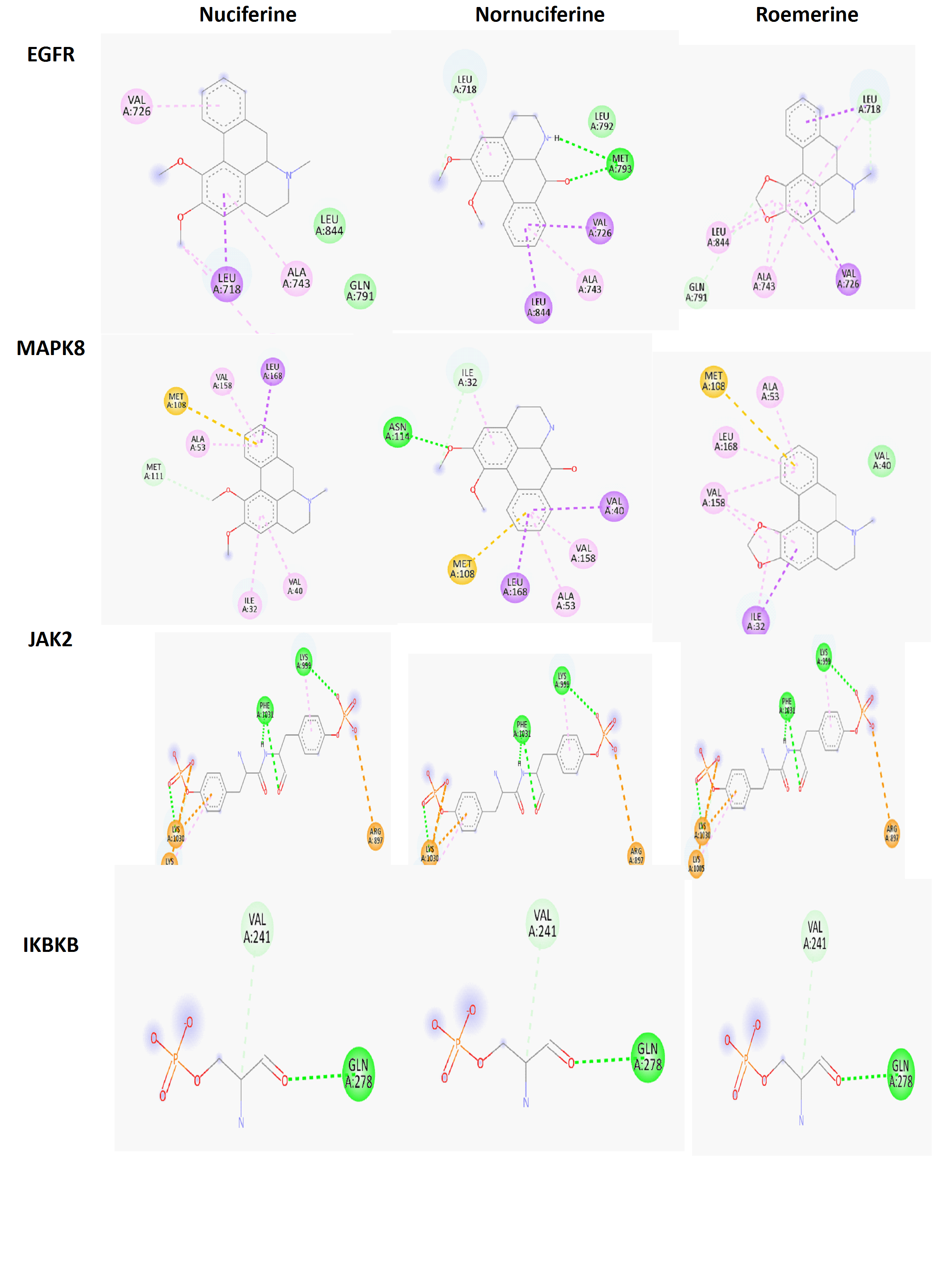 Fig. 6: Molecular docking between nuciferine, nornuciferine, and roemerine with EGFR, MAPK8, JAK2, and IKBKB. Hydrogen bonds were displayed in green and Van der Waals interactions were displayed in light green