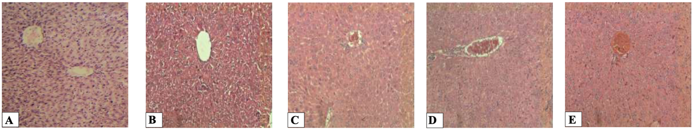 Fig. 1: Histological picture of rat liver tissue 400x (A). Control, (B). 500 mg/kgbw beetroot extract., (C). 1000 mg/kgbw beetroot (D). 2000 mg/kgbw beetroot, (E). 5000 mg/kgbw beetroot
