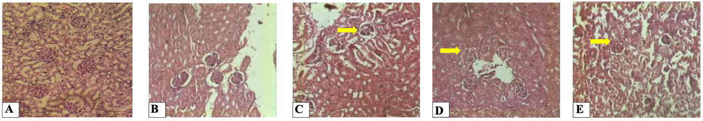 Fig. 2 shows that the histological picture of the kidneys in the control group and 500 mg. kgBW were still normal, there was no increase in mesangial cell proliferation in the glomerulus and Bowman's capsule, which was still clearly visible, whereas in the treatment group, the doses were 1000, 2000 and 5000 mg/kg BW it has begun to show an increase in mesangial cell proliferation (yellow arrow) but no glomerular tissue hypertrophy has been seen.