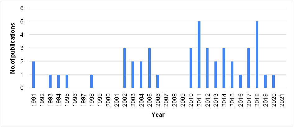 Fig. 2 shows the number of papers published from the year 1991 to 2020. The literature was obtained from various databases i.e. science direct, scopus, taylorand francis, web of sciences, Elsevier, springer, pubmed. The data collected was from 1991-2021. Among all these, year’s highest number of papers were published in the year 2010 and 2018.