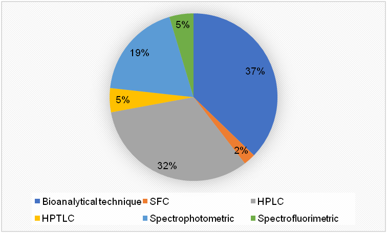 Fig. 3 is the statistical pie diagram representing various analytical techniques proposed for the estimation of LAC. It shows that HPLC and LC/MS/MS, GC/MS are the most widely used chromatographic technique for the estimation of FDP in API, formulations and in biological fluids, respectively.