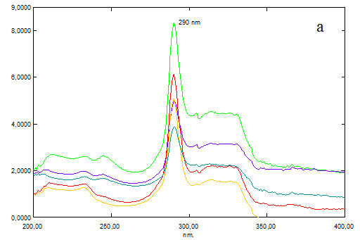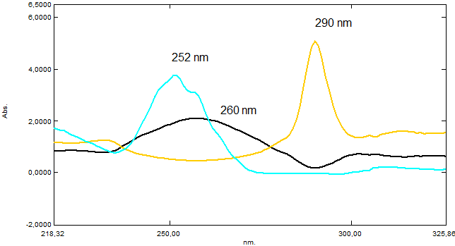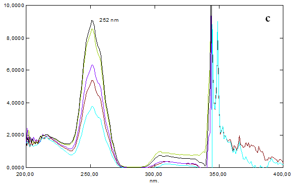The maximum wavelength is chosen by looking for the assay value with the RD method of each spectrum with different concentrations. Based on fig. 1 and 2, DEX showed a linear response at λmax 278 nm, GUA 273 nm and DIF was measured at 252 nm, as shown in fig. 1 and 2.