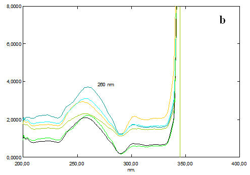 Fig. 1: Absorption spectra of DEX (a), GUA (b), and DIF (c) at various concentrations