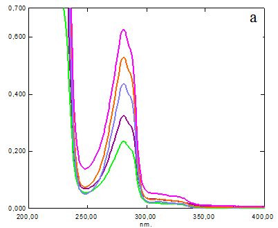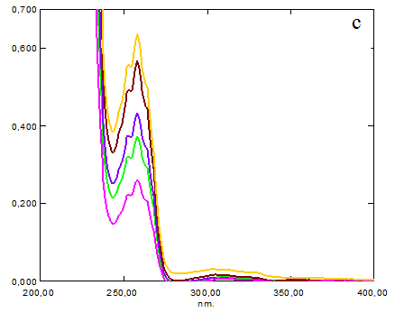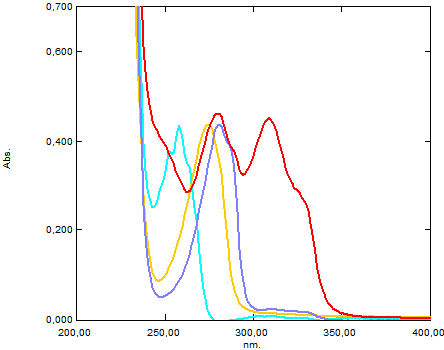 Fig. 2: The absorption spectrum of DEX overlaps 56µg/ml (), GUA32µg/ml (), DIF 13µg/ml (), mixture DEX+GUA+DIF ()