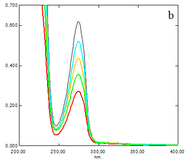 The maximum wavelength is chosen by looking for the assay value with the SRDS method of each spectrum with different concentrations. Based on fig. 1 and 2, DEX showed a linear response at λmax 278 nm, GUA 273 nm and DIF was measured at 257 nm, as shown in fig. 1 and 2.