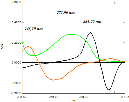 The distribution concentration used in this study was guaifenesin 32µg/ml. Record the first ratio spectrum, which is then converted into derivative one at Δλ 4. Then, the stored spectrum is divided again with 32µg/ml guaifenesin to record the second ratio spectrum, and the results are transformed into derivative two at Δλ 4 [30]. Then the maximum or minimum wavelength is selected which provides the best correlation value, where in this case, the wavelength chosen for DEX is 284.00 nm, GUA 271.90 nm, and DIF 243.10 with a correlation coefficient value of DEX 0. 9996, GUA 0.9992, and DIF oride 0.9997 are given in the spectrum of derivative one at Δλ 4 which can be seen in fig. 3.