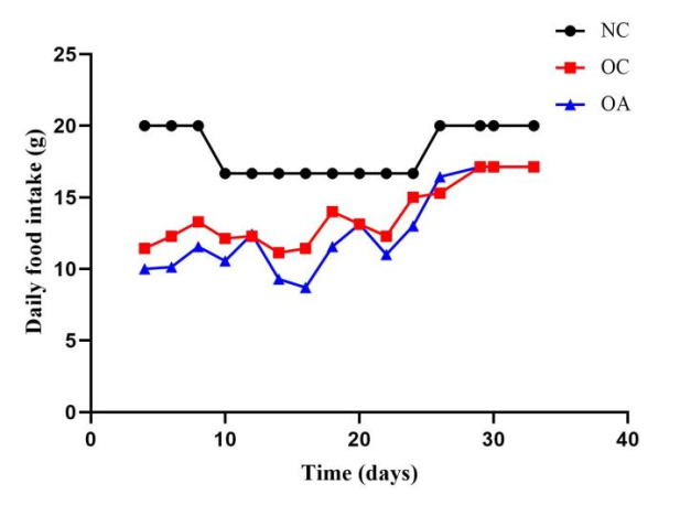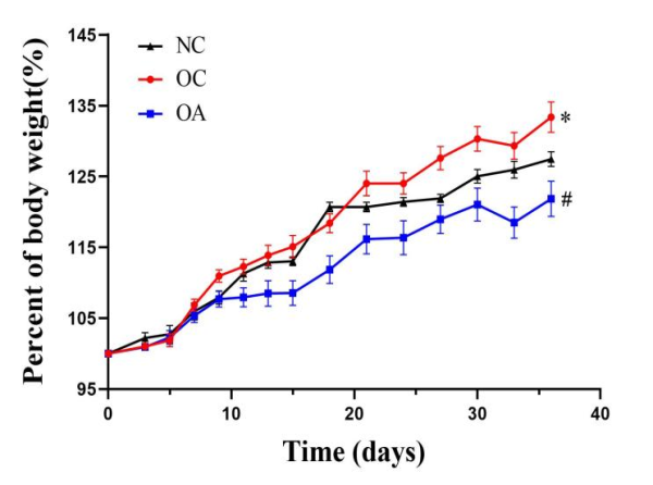 As can be seen in fig. 2, the percentage of body weight of the OC group was significantly greater than that of the NC group (p<0.05), while the percentage of body weight of the OA group was significantly smaller than that of the OC group (p<0.05), even lower than that of the NC group.